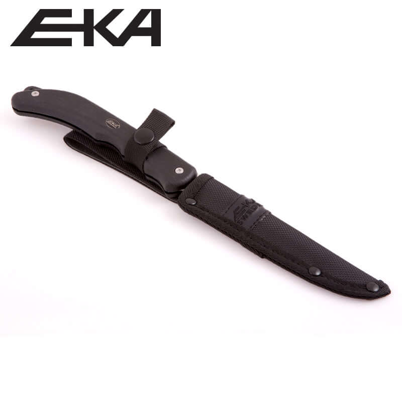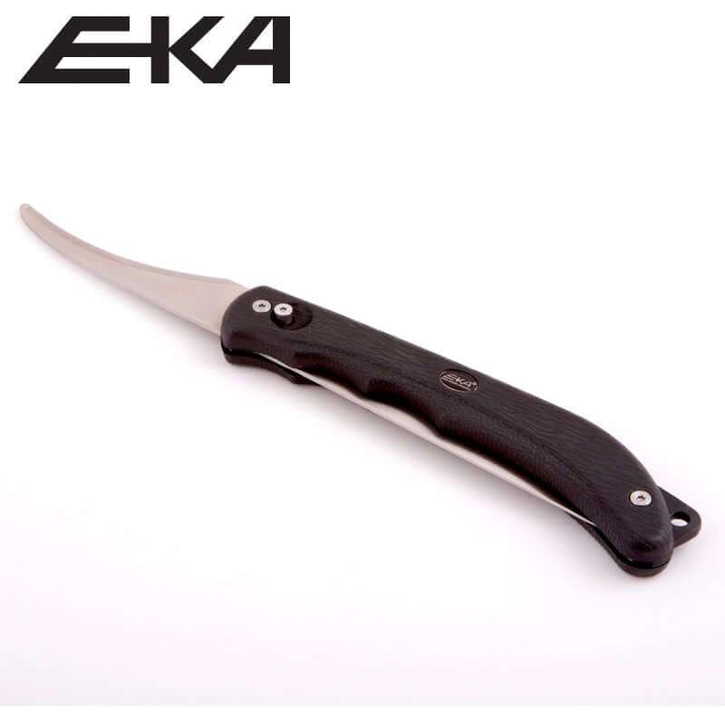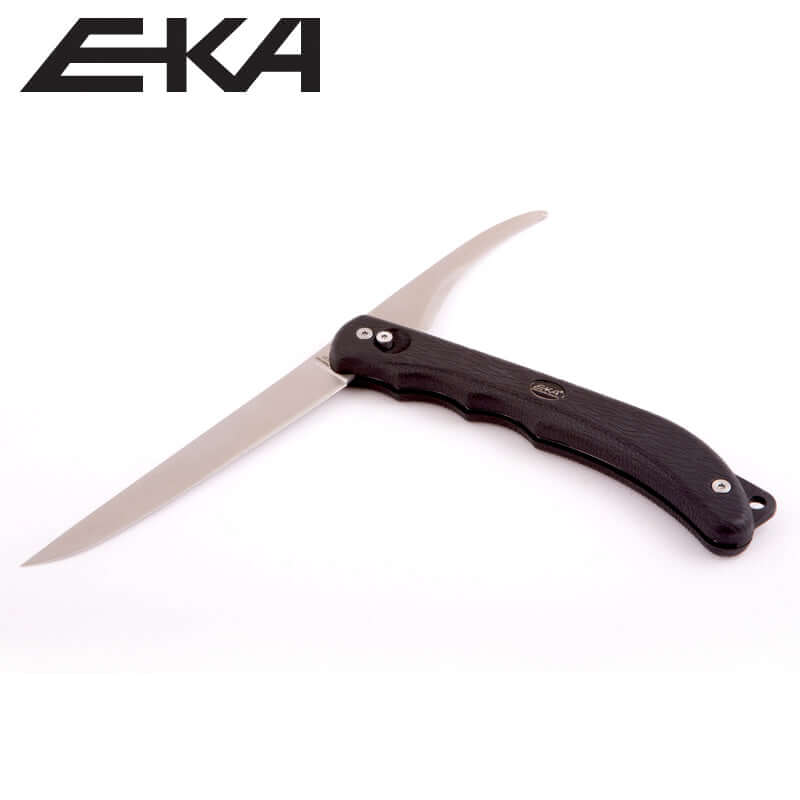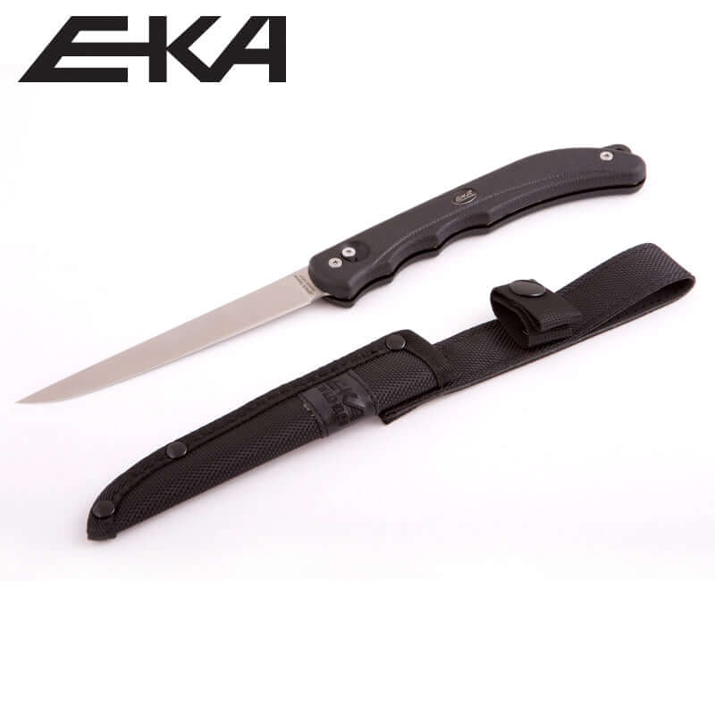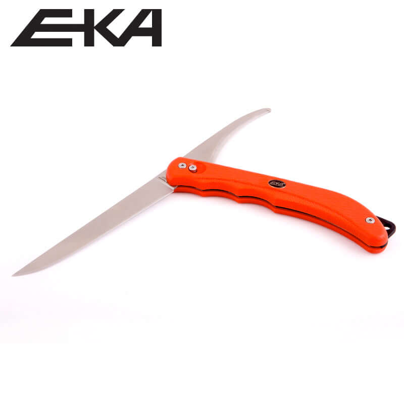 The rotatable filet knife is a hallmark of EKA knives. These twistable little wonders are some of the most useful knives you can imagine! Practical, safe and razor-sharp, they are just as suitable in the kitchen as on a fishing trip or in a sailboat. The design of the knife blade is optimized for all types of fishing. The belly opener with a rounded tip facilitates the work of opening and cleaning the catch. The handle consists of easy-to-grip PROFLEX™ rubber. The knife blade is made of quality steel and has a superb sharpness. Comes with a nice Cordura holster.