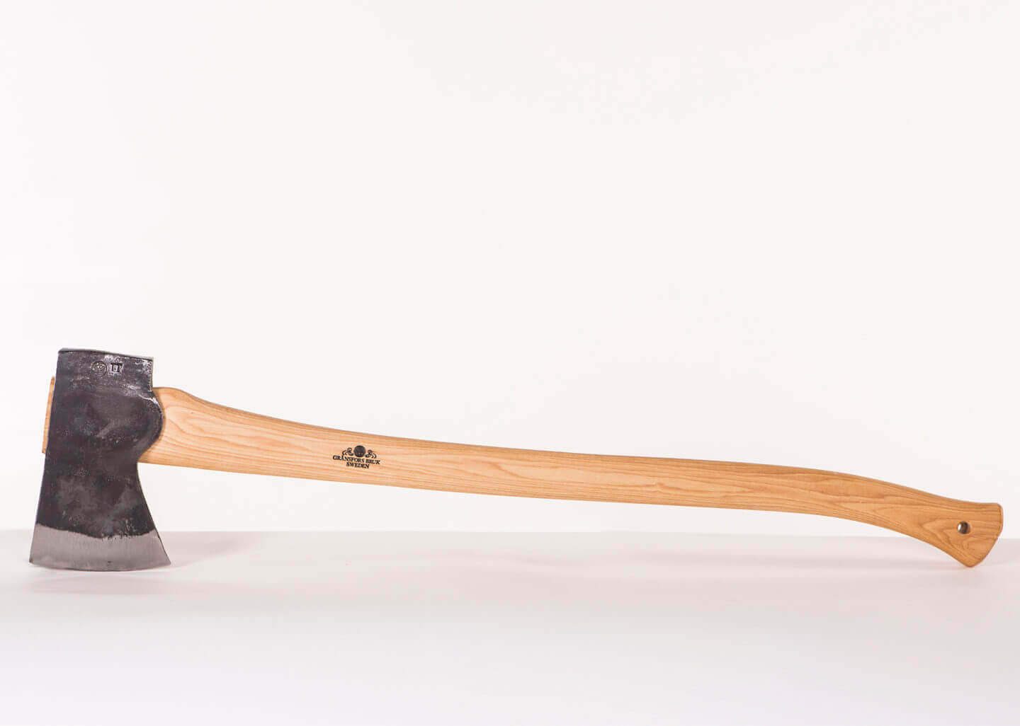 The Gränsfors American Felling Axe is a professional axe for those who want to work in the forest in the traditional way. The axe is ideal for felling very large trees, thanks to its long, broad edge of 11.5 cm. The axe is forged to a curved bit, making it suitable for cutting into fresh, resinous wood such as spruce or pine. The heavy head and long handle also give considerable power to the cut. The axe is almost twice as heavy as the Scandinavian Forest Axe.