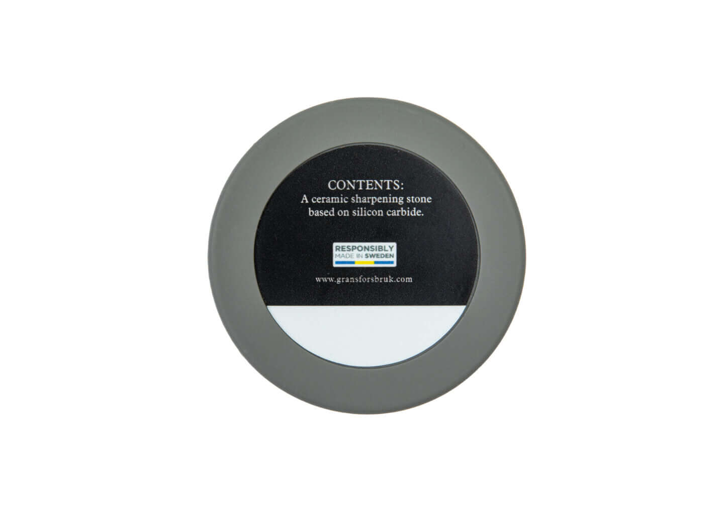 The Gränsfors Sharpening Stone is comprised of ceramic abrasive with a grain structure developed to best supply the needs of coarse and fine grinding. The coarse, 180-grit side is used for repairing damage from hard wear, whereas the finer, 600-grit side is used for fine grinding. The grain structure of the stone makes it both tough and long-lasting. As opposed to a natural stone, a ceramic sharpening stone can be made to have a more precise grain size. The stone has a round, flattened shape with bevelled edges to give a round transition. The fine side makes up 2/3 of the thickness, as this is the side that usually wears the most. The stone is normally used with water, but can also be used dry. The Sharpening stone features a rubber case. Gränsfors Bruk offers three different sharpening products that are all relatively similar to each other: Sharpening Stone, Diamond File, and Natural Whetstone. The main difference between these products is the material, but both the grit size and shape of the products differ as well. Choosing the right product comes down to individual opinion and taste.