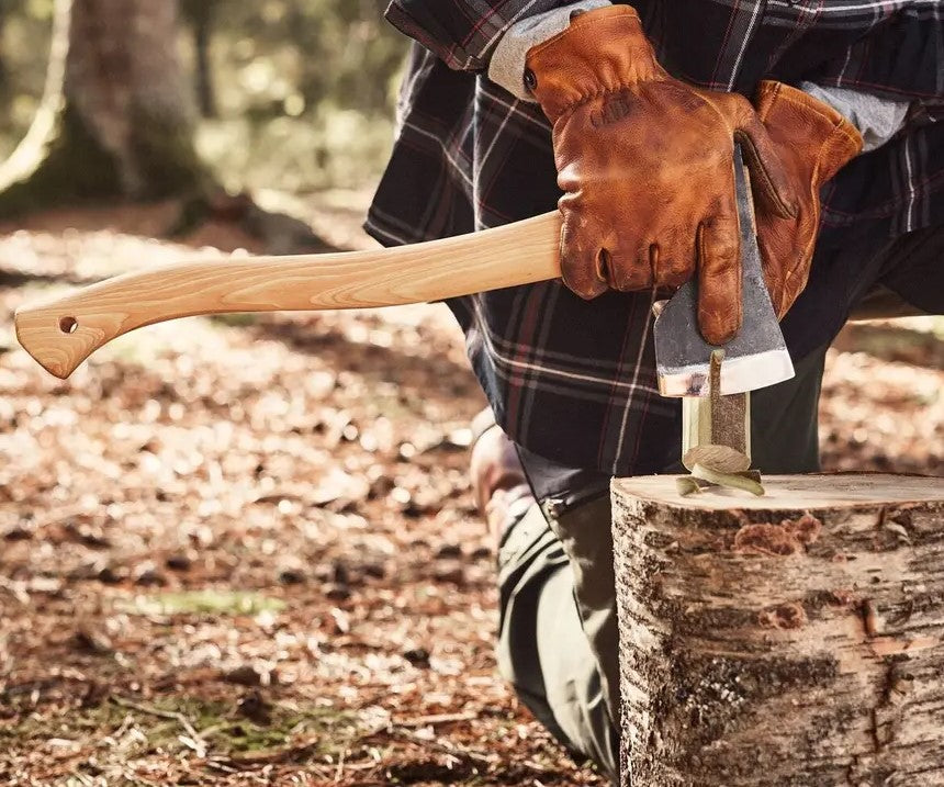 Dvardala is a perfect axe for hunting and forest life. It is a combination of several different axe types, ideal for a day in the forest where you might have to deal with a wide range of challenges. It has the same type of head as the Hultafors Åby axe, but the handle is shorter - 440 mm long (17 inches) - making the axe easier to bring with you, for example in a backpack. The shorter handle also makes it easier when you work with the axe close to the body. The axe is suitable for precision work such as carving or building shelters, fire stands and other things around a camp site. This is thanks to a well-proportioned hand notch and a semi-straight edge with a flat and wide grind. The hand notch allows you to grip around the head and steer the axe with maximum control. The edge is a semi-straight with flatter sides allowing the axe to rest firmly against the work piece when you cut along a piece of wood. But it’s still curved enough so that the axe can be used for lighter forestry work such as clearing a path or a line of fire. The head is a bit thicker over the cheeks giving it good splitting capabilities so you can chop firewood. Dvardala is a gift that hunters anywhere will appreciate, and it could of course also be used for processing game out in the field. The axe is hand-forged in Hults Bruk according to tradition since 1697. The head weighs nominally 0.7 kg and is made of Swedish CO2-neutral axe steel. The semi-straight edge has a Scandinavian premium grind that is polished, razor sharp and ready for use. The axe has a curved, narrow handle with a pronounced end knob for a more secure grip. The sheath is made in Sweden with hides from Swedish cows and it is manufactured with the greatest care for the animals and the environment. The leather is vegetable tanned full grain leather for the best possible durability and the natural treatment means that it will age beautifully when worn. The axe is named after Dvardala, which is an old name for the forest area just north of Hults Bruk. This is where the Kolmården Forest begins and from Borgar mountain in Dvardala you have a fantastic view of the area, which is known for good hunting of both wild game and wild boar. Take care of your axe, and it will be a faithful friend for many years to come. We are very proud of the craftsmanship and quality of our axes, and we give you a lifetime warranty on the axe head.