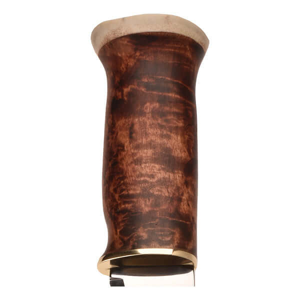 Handmade knife for big hands! This is a solid outdoor knife made of curly birch and stainless steel with a brass guard. Since the handle is rather big it is suitable for a person with big hands. The knife is delivered in a reindeer leather sheath with a ribbon for attaching it to your bag or belt.