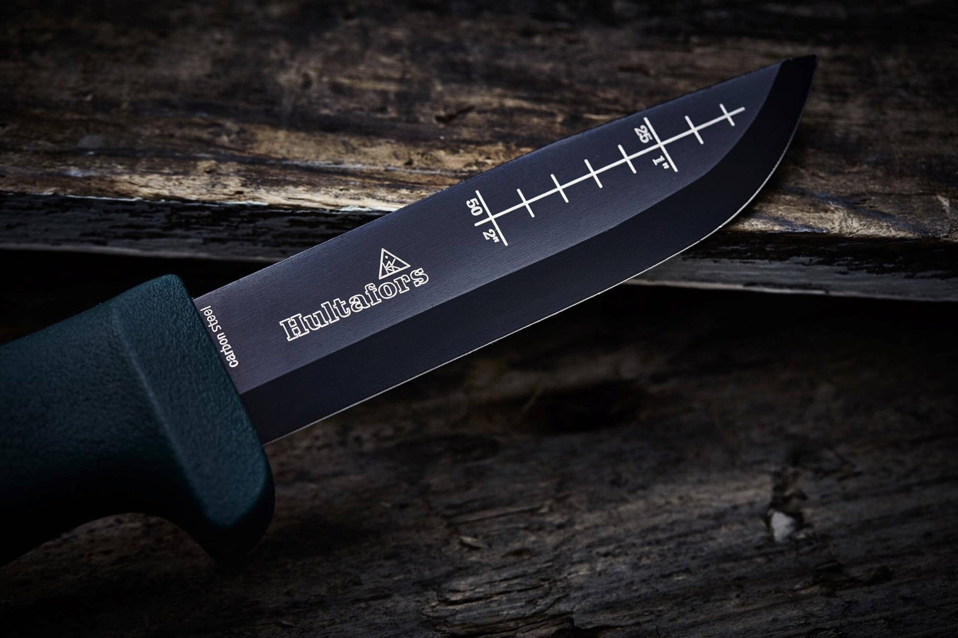 A powerful and durable outdoor knife with a larger handle suitable for tough tasks in the field. The hardwearing textile belt loop allows up to 80mm wide belts and is equipped with a pocket for a fire starter. The blade has a scandi grind and is made from Japanese knife steel, 3.0 mm carbon steel that has been hardened to 58–60 HRC and has a rust protective electrophoretic deposition coating to withstand corrosion. The grinded spine of the blade is designed for starting a fire with a fire starter.