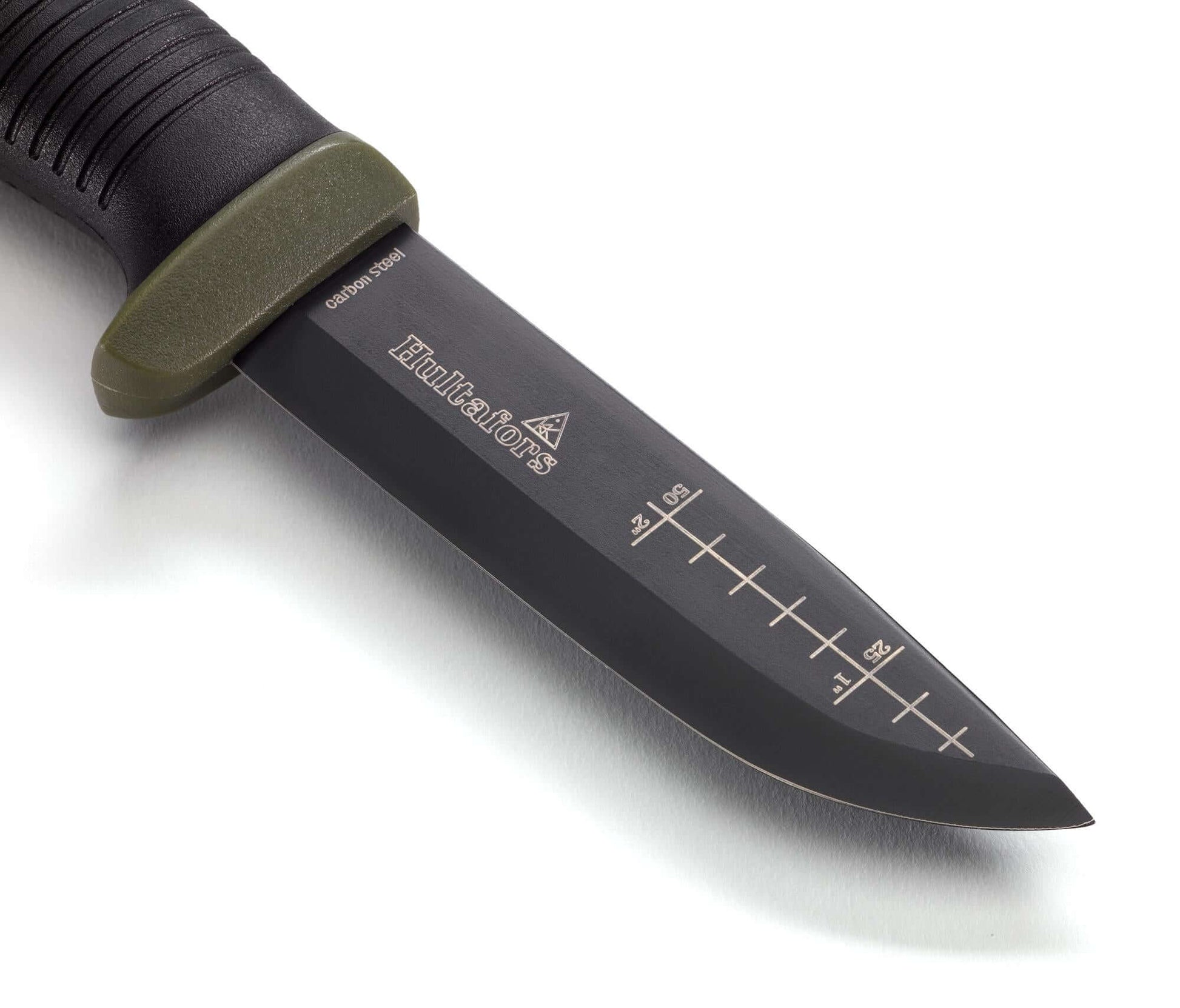 A durable outdoor knife with friction grip suitable for tough tasks in the field. The hardwearing textile belt loop allows up to 80mm wide belts and is equipped with a pocket for a fire starter. The blade has a scandi grind and is made from Japanese knife steel, 3.0 mm carbon steel that has been hardened to 58–60 HRC and has a rust protective electrophoretic deposition coating to withstand corrosion. The grinded spine of the blade is designed for starting a fire with a fire starter.